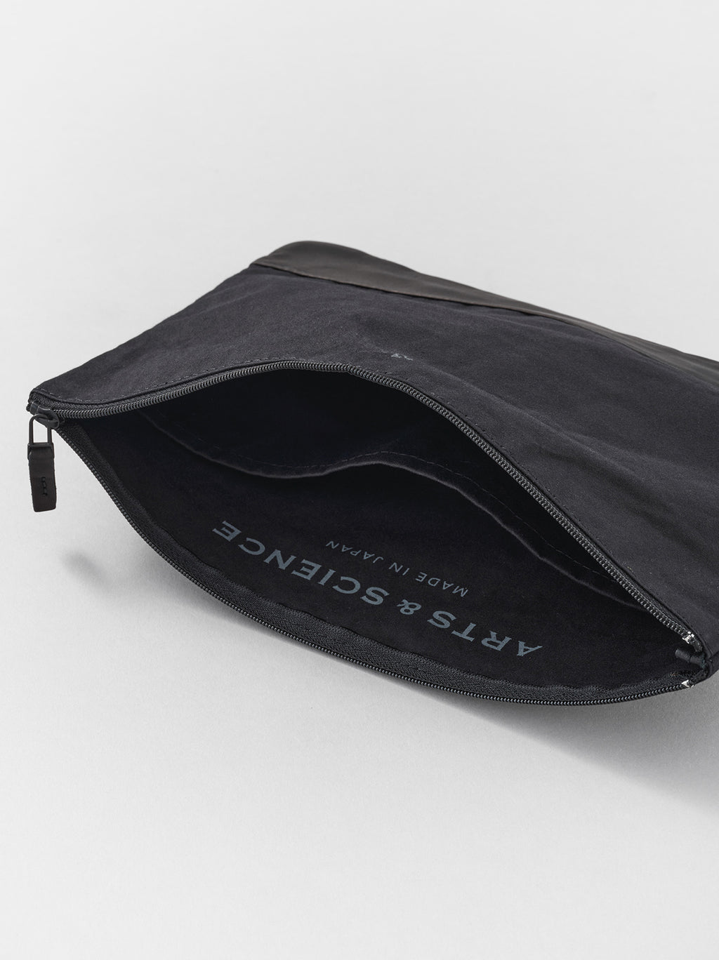 The Combi pouch L is made in a combination of high-density cotton fabric and leather. The size L fits a B5 size notebook or file snugly. The pouch can be used for multi-purposes, such as sorting items to store in your bag or to organize your personal goods for travels. The high-density woven fabric is water-resistant, breathable and durable. The leather used in parts of the bag, including the zipper tip, is washable leather, and is safe to wash with water. The product is pre-washed to give it a worn in look and feel. The pouch is made of a single piece of unlined fabric and has one inside pocket made in the same fabric. The exterior features our key mark, while the interior is printed with the ARTS&SCIENCE straight logo.