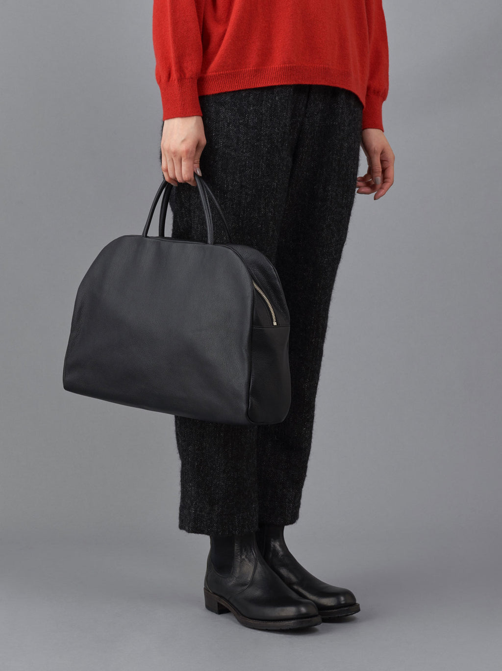 This medium size A&S standard type school bag made of baby goat leather in fine grain, that fits A4 size documents. The bag features a double-zip opening and two zippered pockets inside. The outer surface is made of fine-grained goat leather from Italy, and the interior is made of cowhide leather, a durable bag made to be used for a long time. An elegant design with thin handles and rounded form. Available in two colors, Black and Gray beige.
