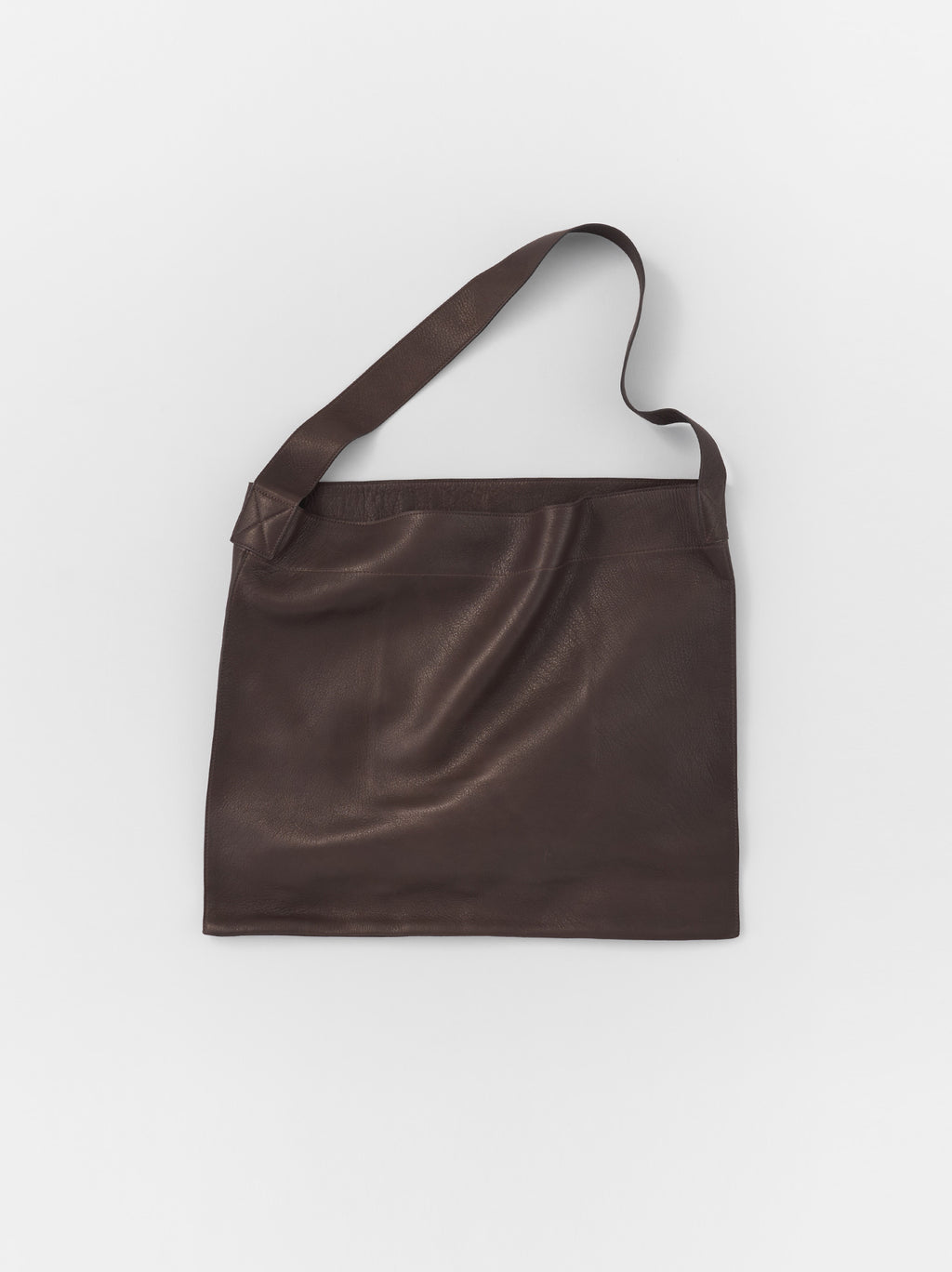 A large size one-shoulder tote made with supple and plush deer leather. The L size offers enough space to store documents and a PC. To prevent scratches, the interior is crafted with sturdy Nubuck leather. It has a moderate thickness, ensuring excellent durability. Its single-layer construction without lining adds to its lightweight charm. The long handle can also be used for crossbody wear. Inside, there is one pocket, and at the base of the handle, the straight logo of ARTS&SCIENCE is foil-stamped. Available in two colors: Dark brown, and Black.