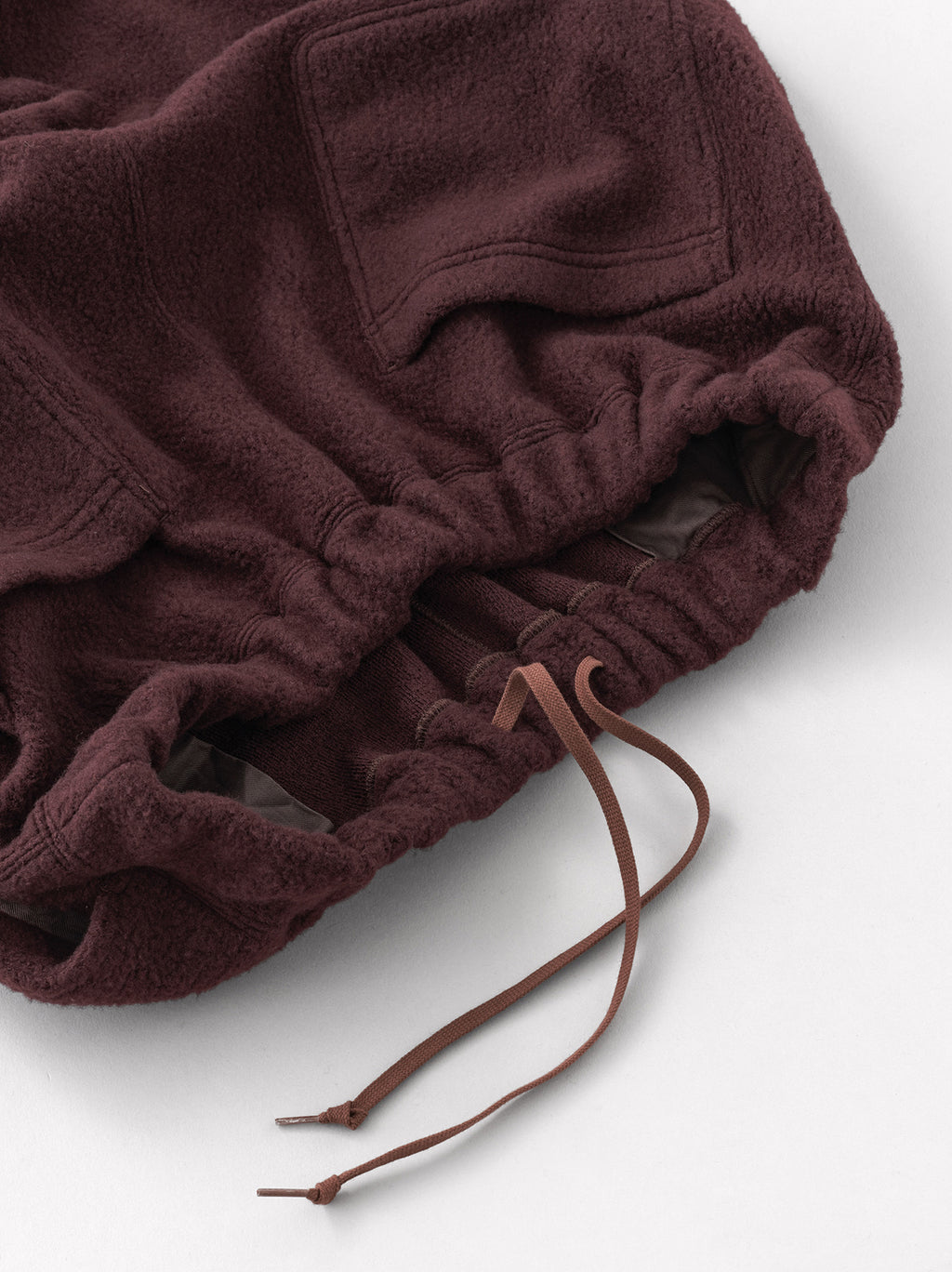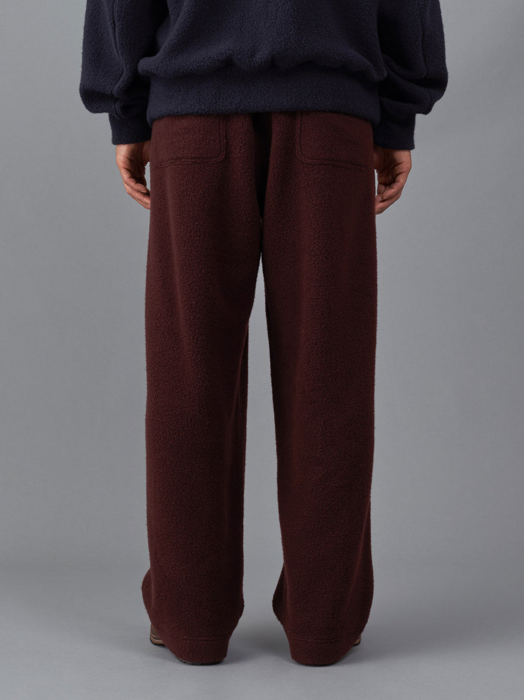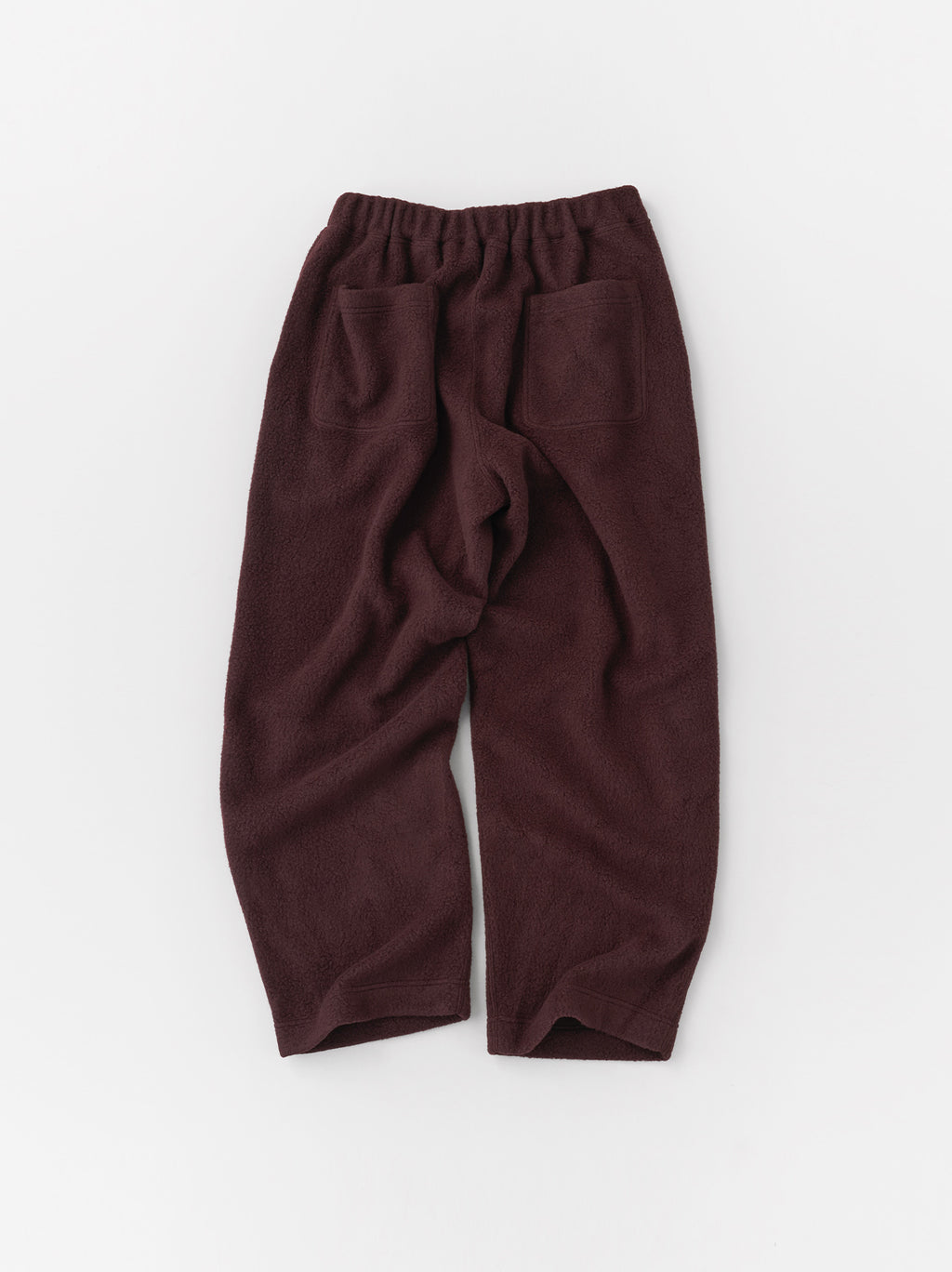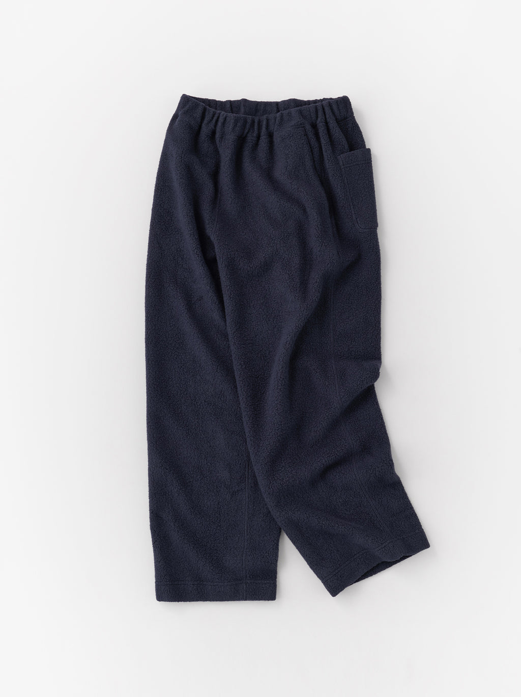 Relax mountain tapered pants crafted from premium wool boa fleece. Featuring a relaxed wide silhouette with slightly tapered hems, these pants are simple, easy to move in, and offer a comfortable wearing experience. The waist is elastic for a relaxed fit. The carefully knitted fabric is slowly fulled in the finishing process to increase its density, providing excellent heat retention and warmth. The same fabric is also used for the Stand collar simple cardigan and Bulky sweat shirt.