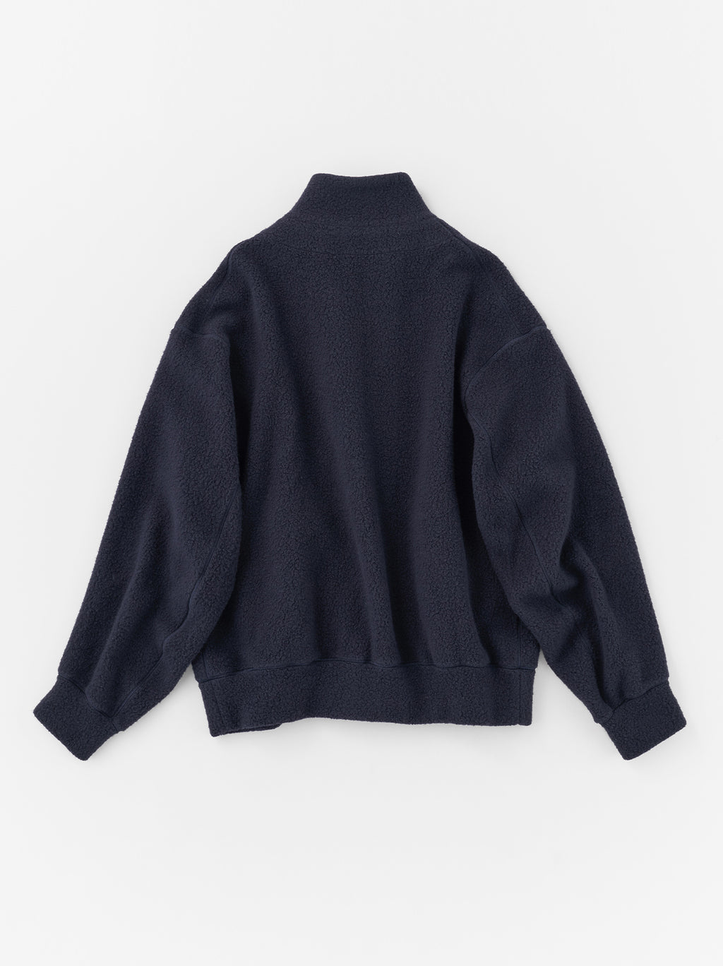 Stand collar simple cardigan crafted from premium wool boa fleece. Its light material and relaxed silhouette make it easy to throw on both indoors and when going out. The simple design includes side pockets that also function as hand warmers. The fabric is carefully fulled in the finishing process to increase its density, giving it excellent heat retention and warmth. The same fabric is also used for the Bulky sweat shirt and Relax mountain tapered pants.