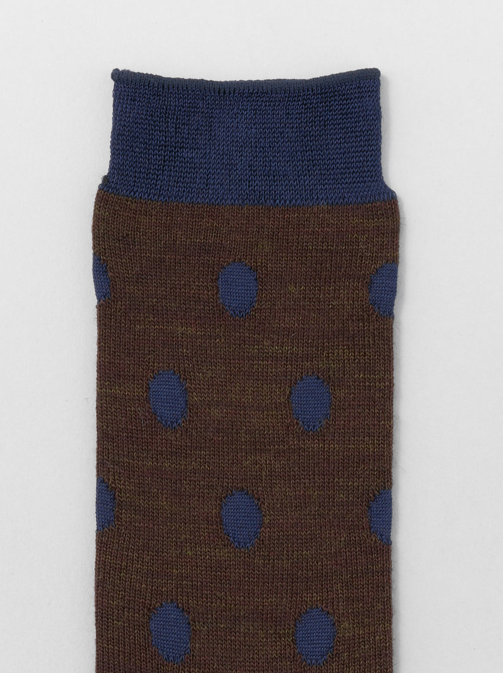 These dot-pattern socks are in a special-order color from ANTIPAST, a brand known for original designs that encourage creative styling and coordination. Knitted in a double-face design, the exterior is wool while the interior is cotton, making them comfortable even for those sensitive to the texture of wool or lamé threads. The two-tone dark colors create a chic, sophisticated, and elegant look. Available in two colors: Dark brown and Orange.