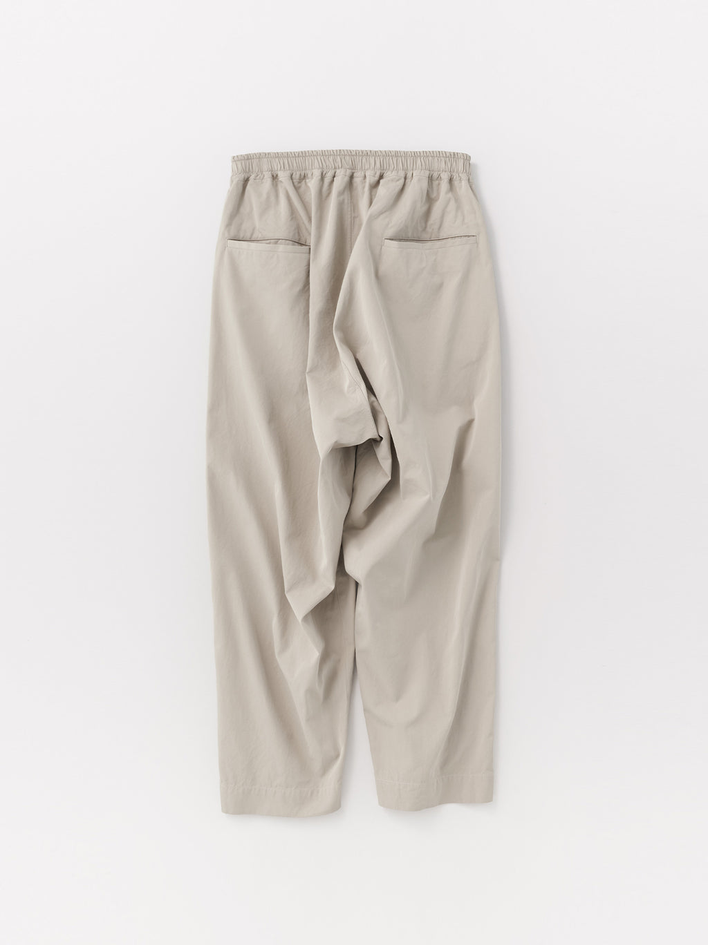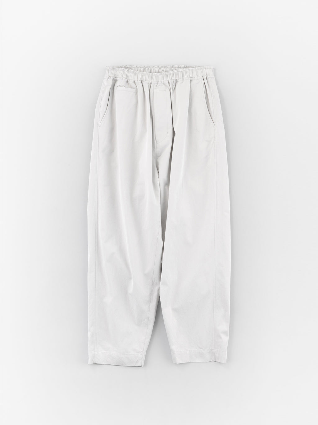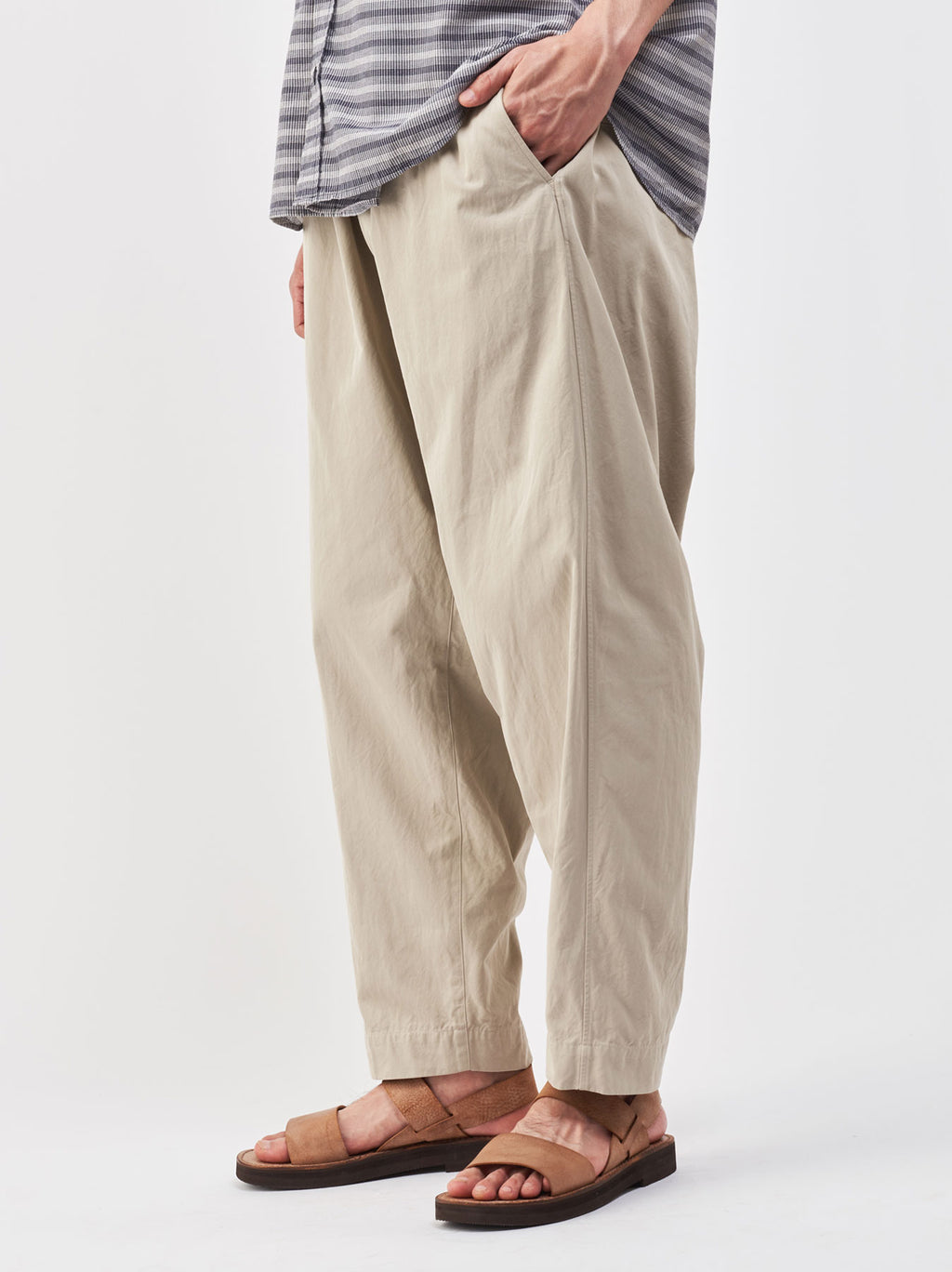 A cropped easy pant inspired by classic chinos. Generously cut through the waist and thighs, the silhouette features a well-defined taper that narrows toward the hem. The elastic waistband and drawstring provide a relaxed, comfortable fit. A coin pocket is placed at the right hip, in keeping with traditional chino detailing. The fabric is cotton gabardine—A&S’s standard fabric, developed with inspiration from vintage textiles. Available in four colors: Sand beige, Dark mocha beige, Vintage white, and Black.