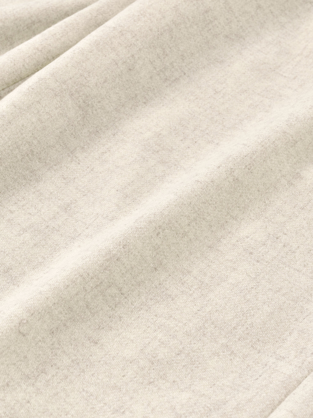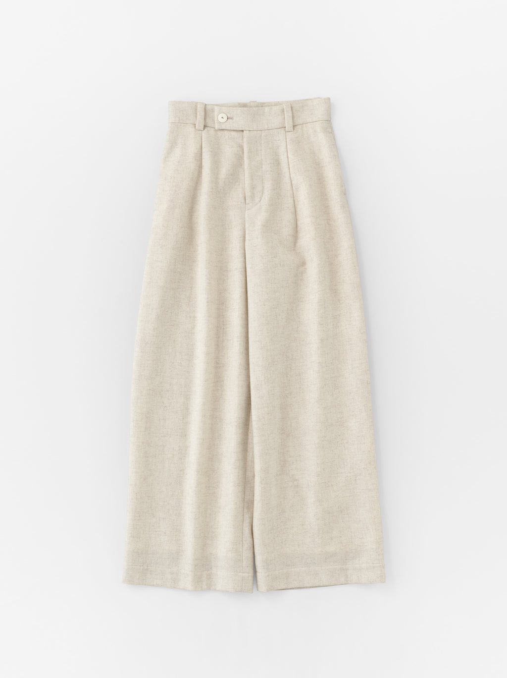The Dart front wide pant features front darts and a wide silhouette, designed with a relaxed shape that falls naturally from the waist to the hem. It is crafted from a flannel fabric made with rare white yak wool, whose fine, long fibers provide excellent heat retention and moisture regulation, offering qualities comparable to cashmere.