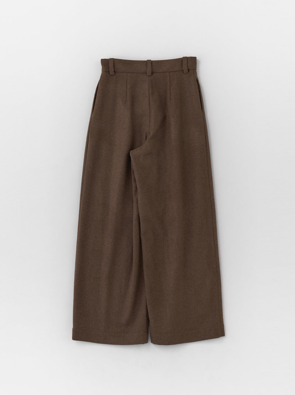 The Dart front wide pant features front darts and a wide silhouette, designed with a relaxed shape that falls naturally from the waist to the hem. The flannel fabric is crafted from yak wool, whose fine, long fibers provide excellent heat retention and moisture regulation, offering qualities comparable to cashmere.