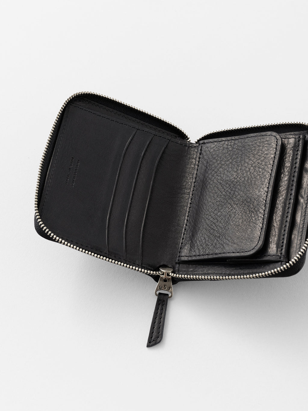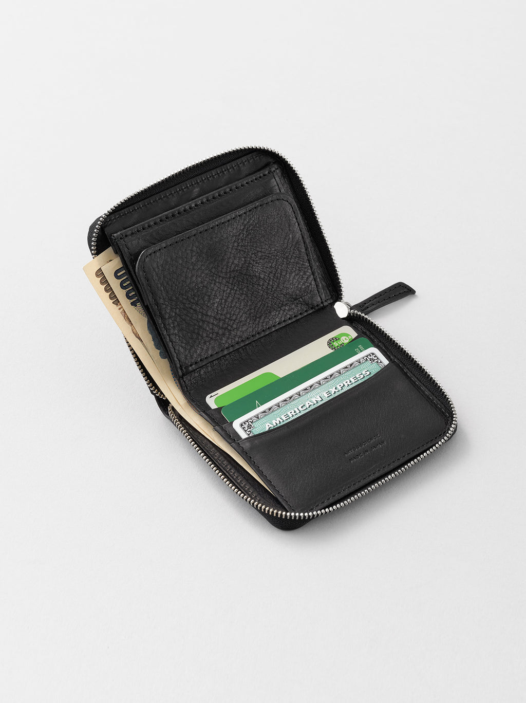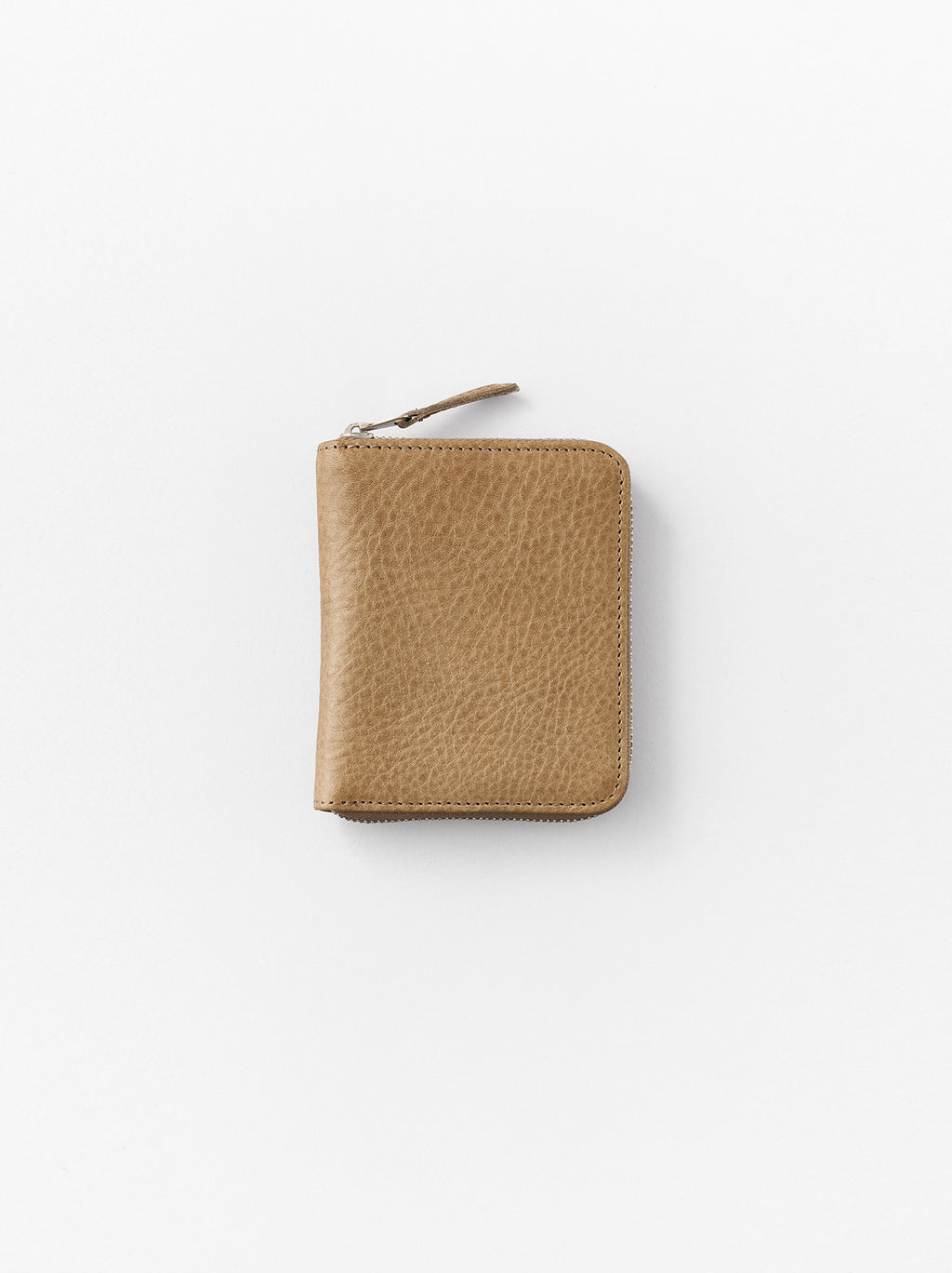 The Zipper mini wallet is a more compact version of the A&S standard Zipper short wallet. In addition to a coin case and a bill compartment, it is equipped with three interior card slots and one exterior card slot positioned on the reverse side of the coin case panel. Despite its compact size, it offers excellent storage capacity. The leather is crafted at a long-established tannery in Tuscany, Italy, using the traditional vacchetta tanning method. Beef tallow is infused into the hide so the oils remain, giving the leather lasting durability and a rich, nuanced character. The natural grain that develops during the tanning process is another defining feature.