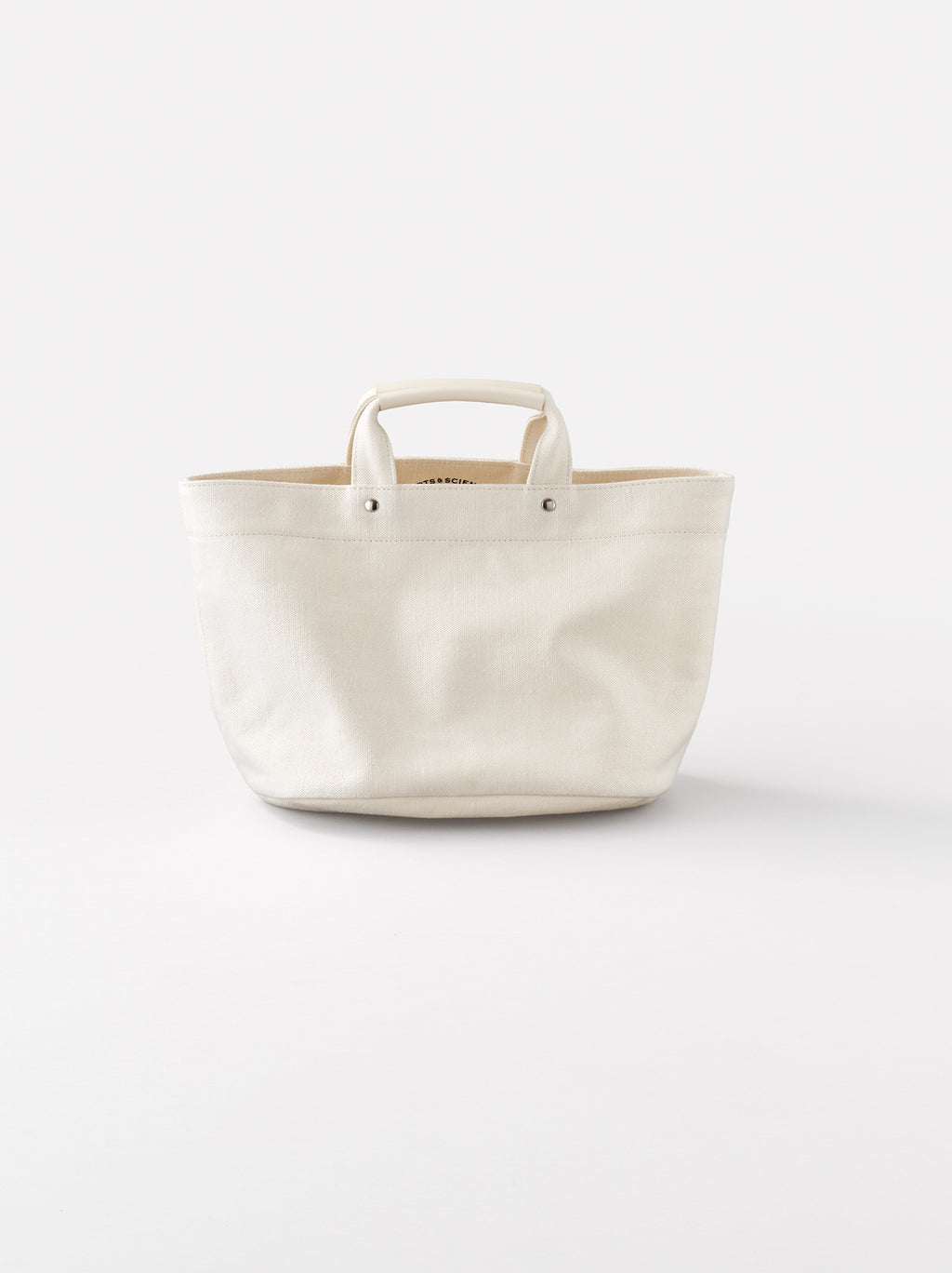 XS size tote bag made of original linen canvas, small in size with a wide gusset at the bottom, recommended as a lunch bag. The handles are made of cowhide leather. Available in Standard, Small, XS, and XXS sizes.